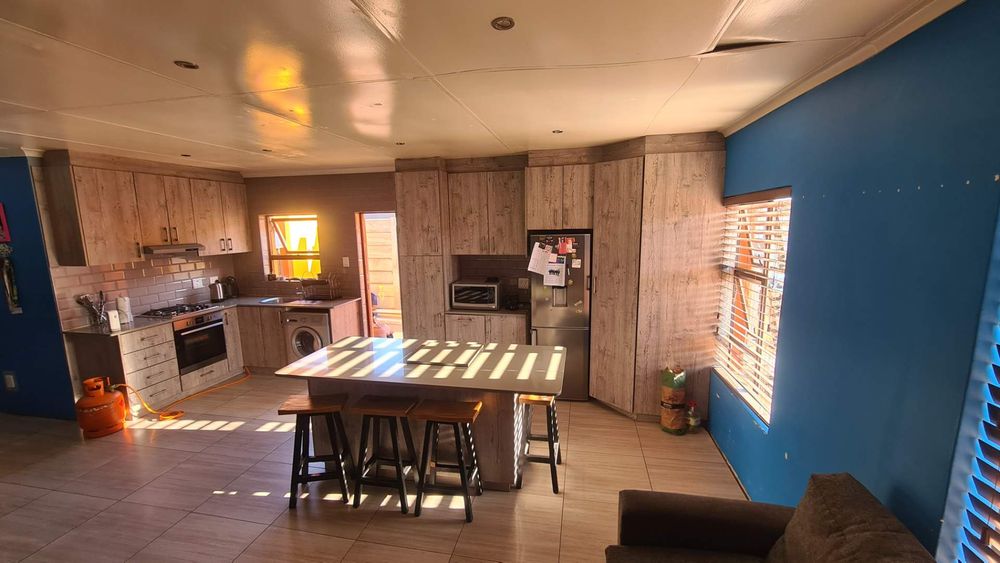 Step into the spacious main bedroom, complete with an en-suite bathroom and generous built-in cupboards, providing ample storage space. The home features a fully fitted open-plan kitchen that seamlessly flows into a cozy lounge area, creating an inviting atmosphere ideal for family gatherings and entertaining guests.